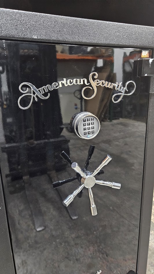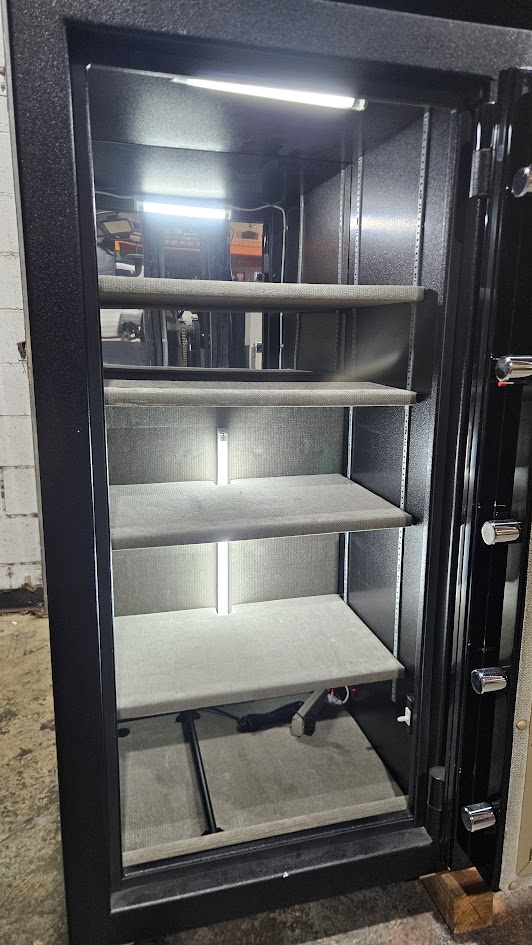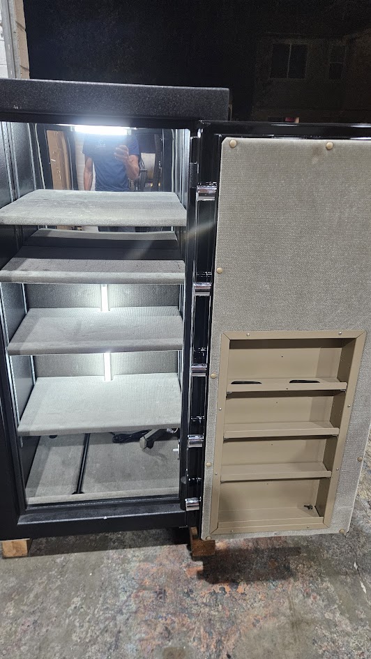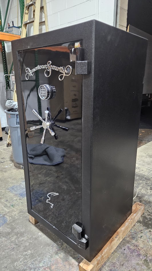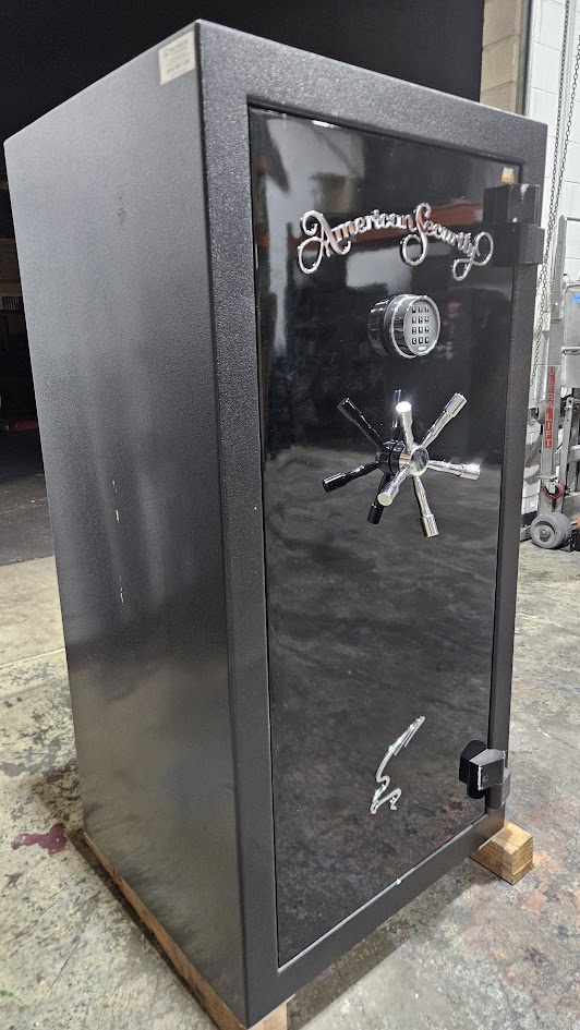 This used American Security BF6030 was made in the USA, built in Fontana, CA. This safe has a few cosmetic paint blemishes but is very well equipped with both the original shelved interior and an aftermarket flexible gun interior. It also has LED lighting, a dehumidifier, and an American Security ESL-10 electronic lock. These are very well built home/office/gun safes with a 1/2″ solid plate steel door and two layers of body steel encasing a poured-in fire lining. Equipped like this in their two tone finish (textured body with a gloss door), a new BF6030 costs upwards of $5,500. This is your chance to get a high end safe for a very reasonable investment!
