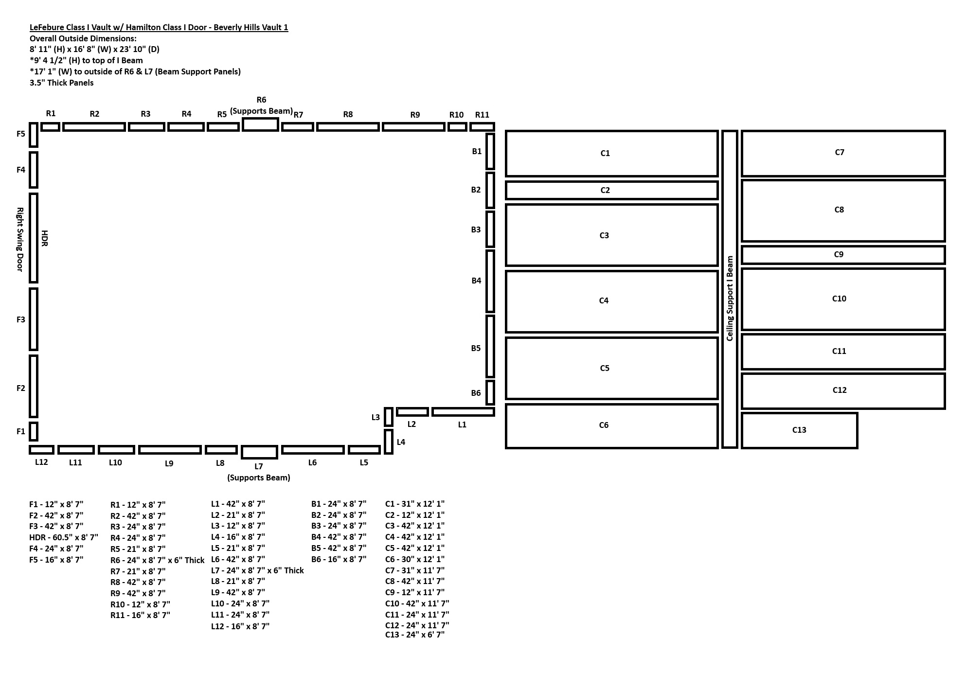 This is an exceptionally large vault. It is a LeFebure Class I Modular bank vault with a Hamilton Class I door that came out of a closing bank branch in Beverly Hills, CA. The vault was professionally disassembled and removed by our crew and then transported to our facility for storage. We have all necessary panels needed to reassemble. Everything was verified to be in good working order before disassembly and the door has remained packaged up and stored indoors. This includes the full vault with all necessary panels, door frame, and vault door. This is a Class 1 Bank Vault, which is equivalent to a TL-30 rated safe. We can offer full vault installation services and can install anywhere in CA, AZ, or NV. The price of the vault does not include freight or installation. For installation we need good forklift access to and surrounding the space with at least 1 foot of open space above the vault to maneuver the ceiling panels into place.